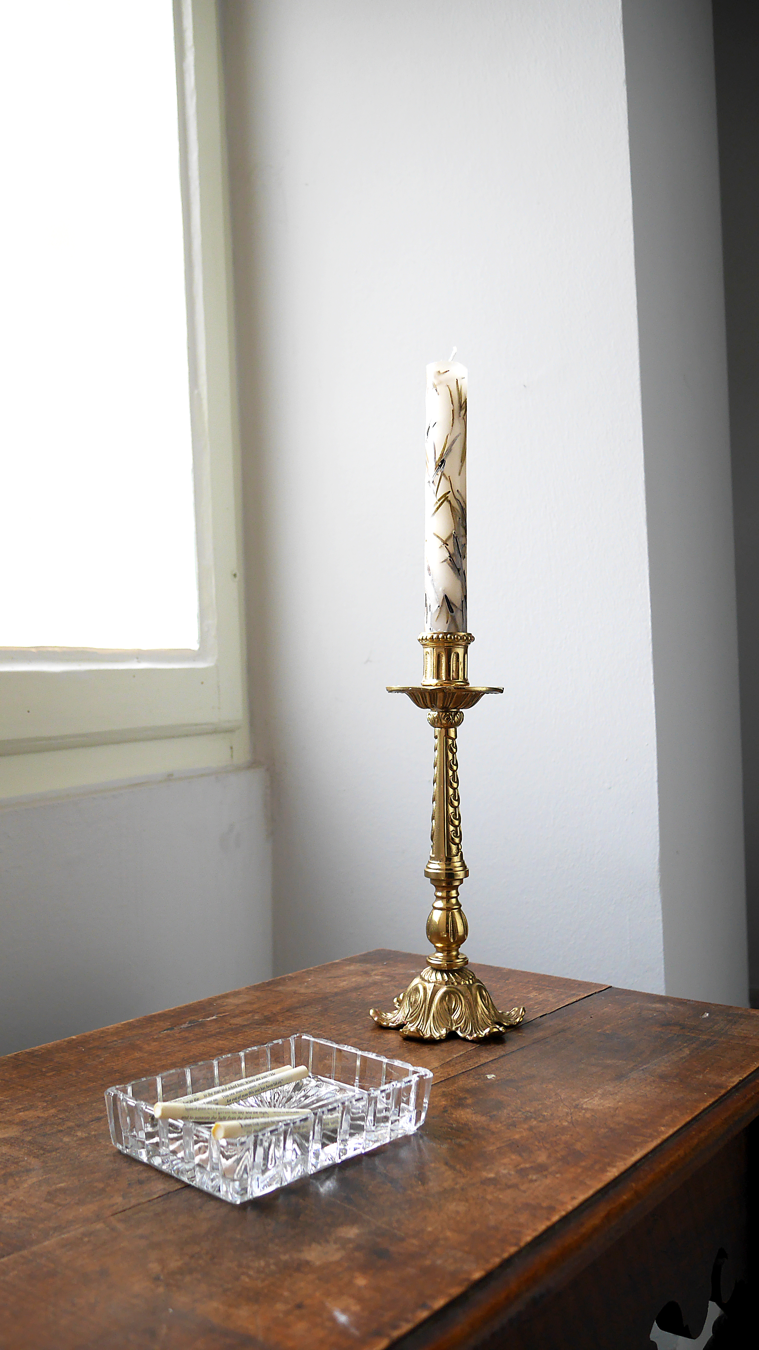 Ritual, single channel video 8’ 05”, rosemary, brass candelabra, cut glass ash tray, pages from Genesis 2 & 3: King James Bible