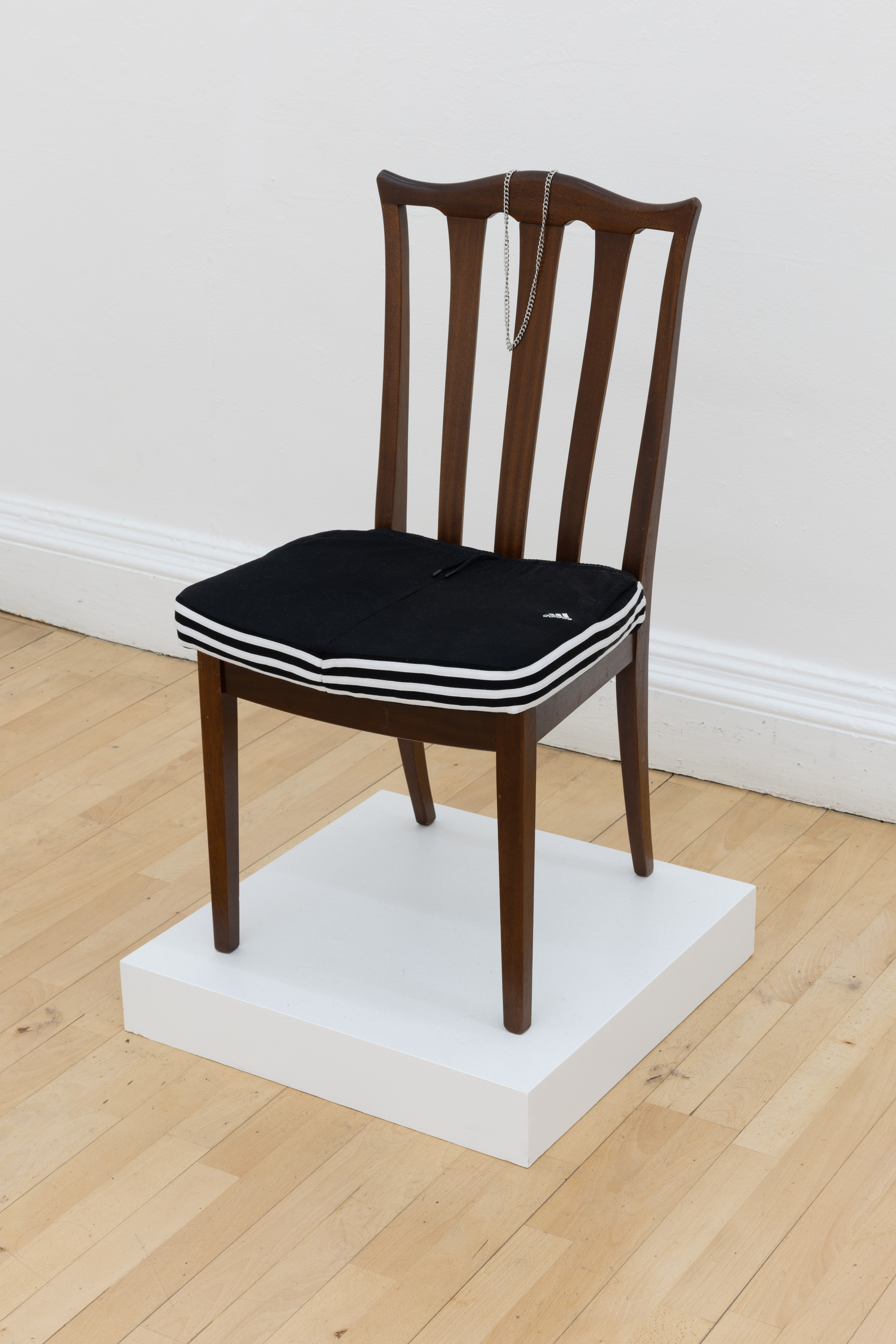 AC Larsen, Bacon Butty, 2024, Fake King Charles III £50, bank notes, Kingsmill sliced white bread, Gold plated Cuban Chain, paper plate, Vintage wine table, Installation shot